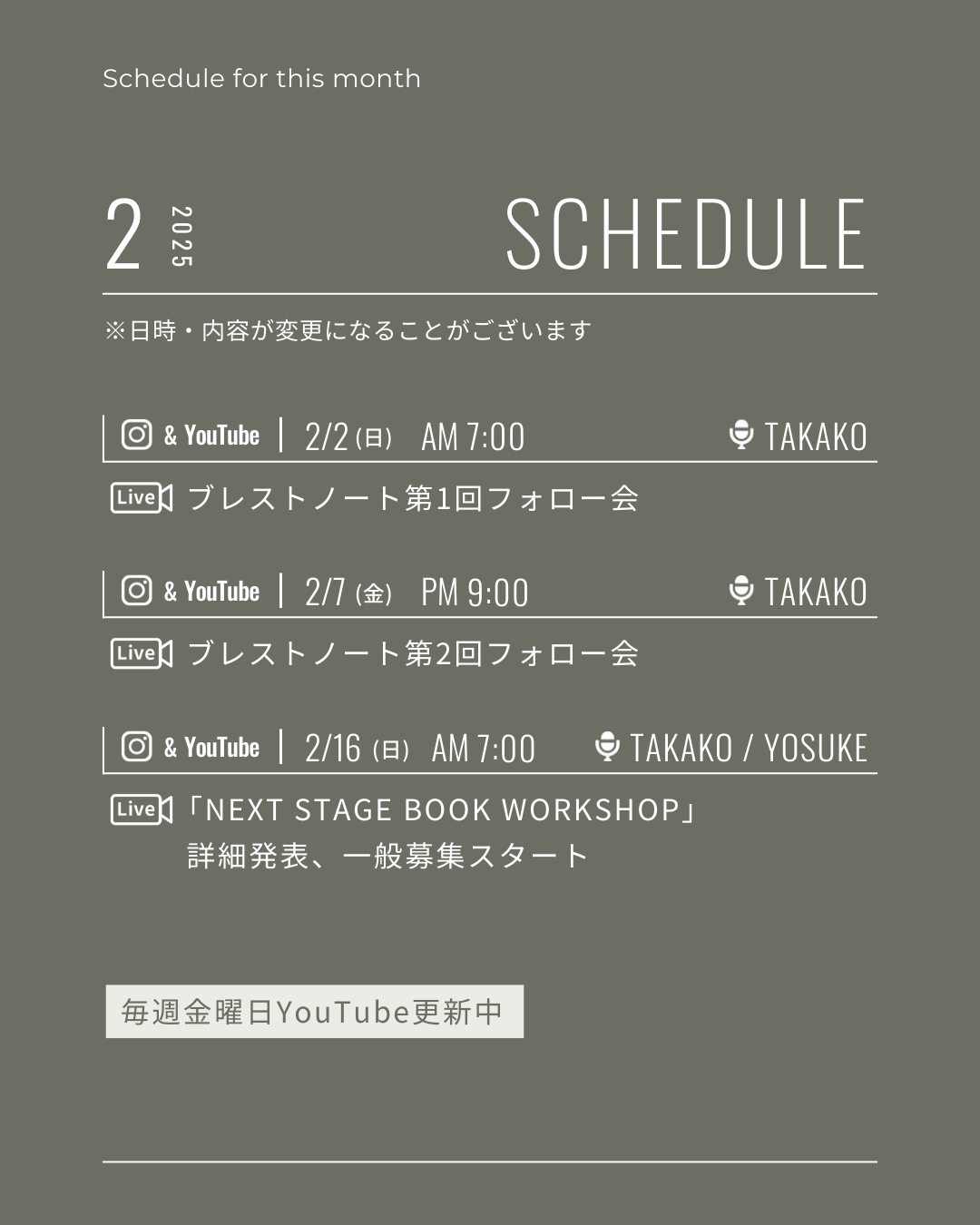Screenshot 2月のLive日程 ■ 2/2(日)AM7:00 ブレストノート第一回フォロー会■ 2/7(金)pm9:00 ブレストノート第二回フォロー会■ 2/16(日)AM7:00 next stage book workshop詳細発表・一般募集スタート
