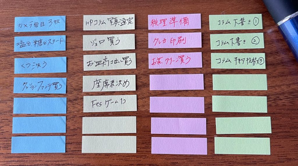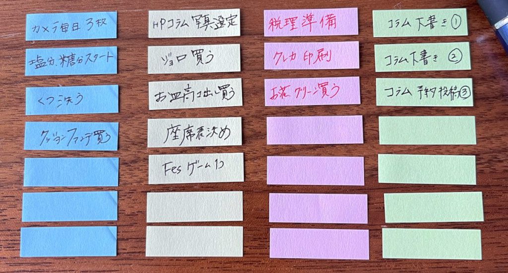 タスクの洗い出し方法は、テーブルor下敷きに4色のミニ付箋を一気に貼ります。