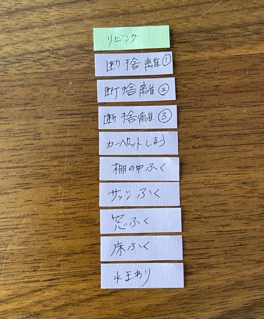 そうすると、付箋にはタスクとして、【部屋掃除】【断捨離】【整理整頓】と記入するかと思います。
